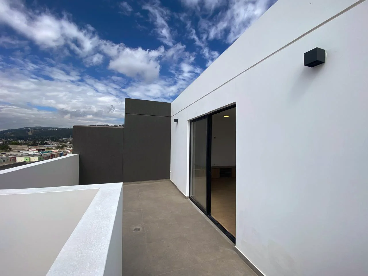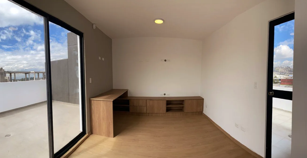 Tercer nivel / terrazas: sala de estar o estudio, dos terrazas de 16 m² cada una (con área de máquinas y lavandería cubierta), con vistas panorámicas de la ciudad, montañas y volcanes.
